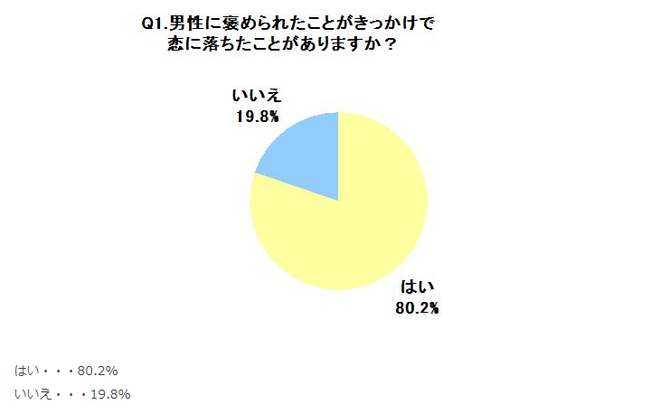 PRTIMESによると、「褒められたことがきっかけで、恋に落ちたことがある」と回答した女性が8割を占めており、『褒めることが惚れ薬』といっても過言ではないでしょう。